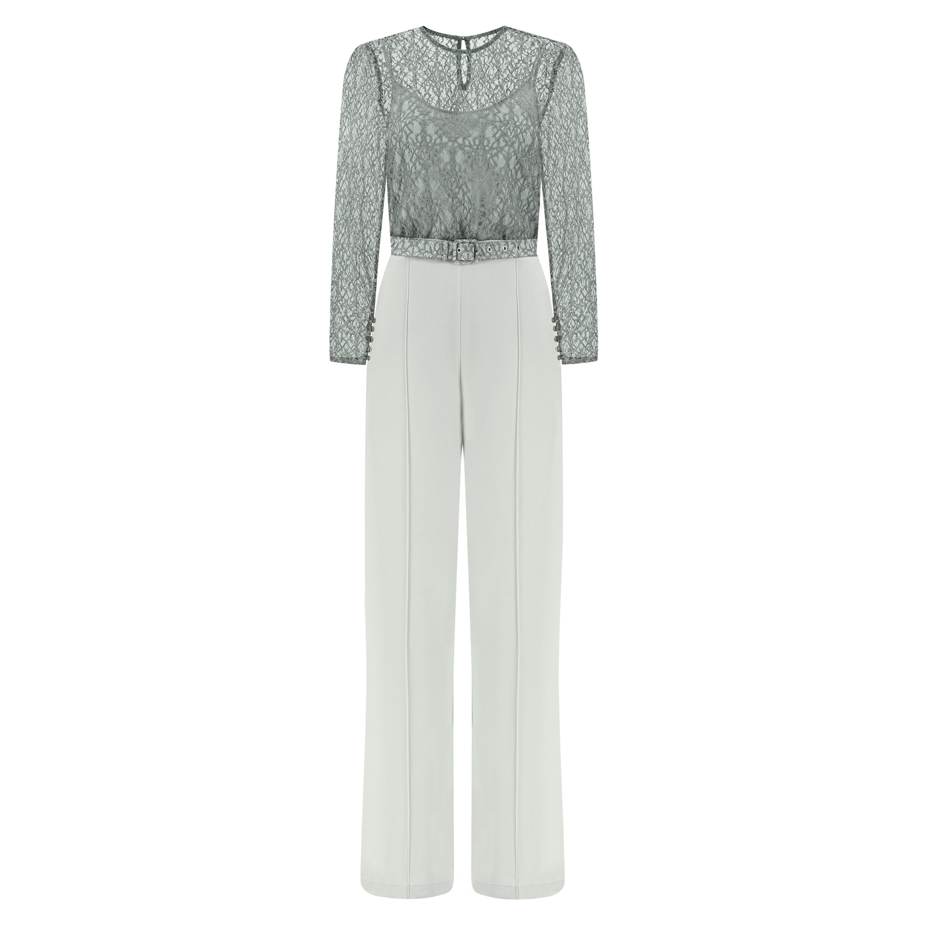 Straight-cut pants paired with a round-neck lace top over a plain camisole