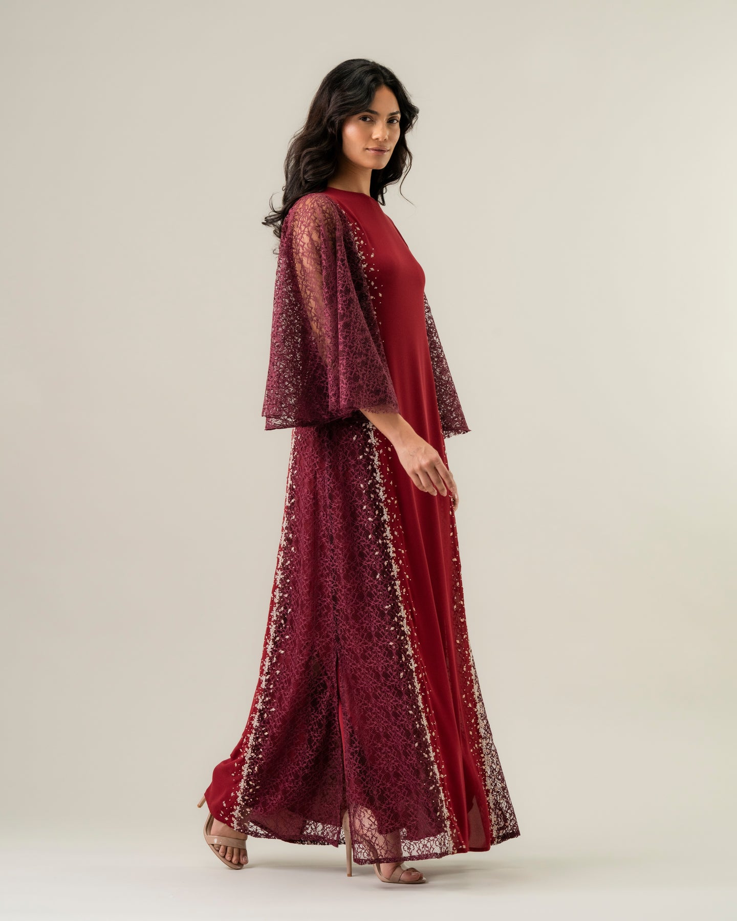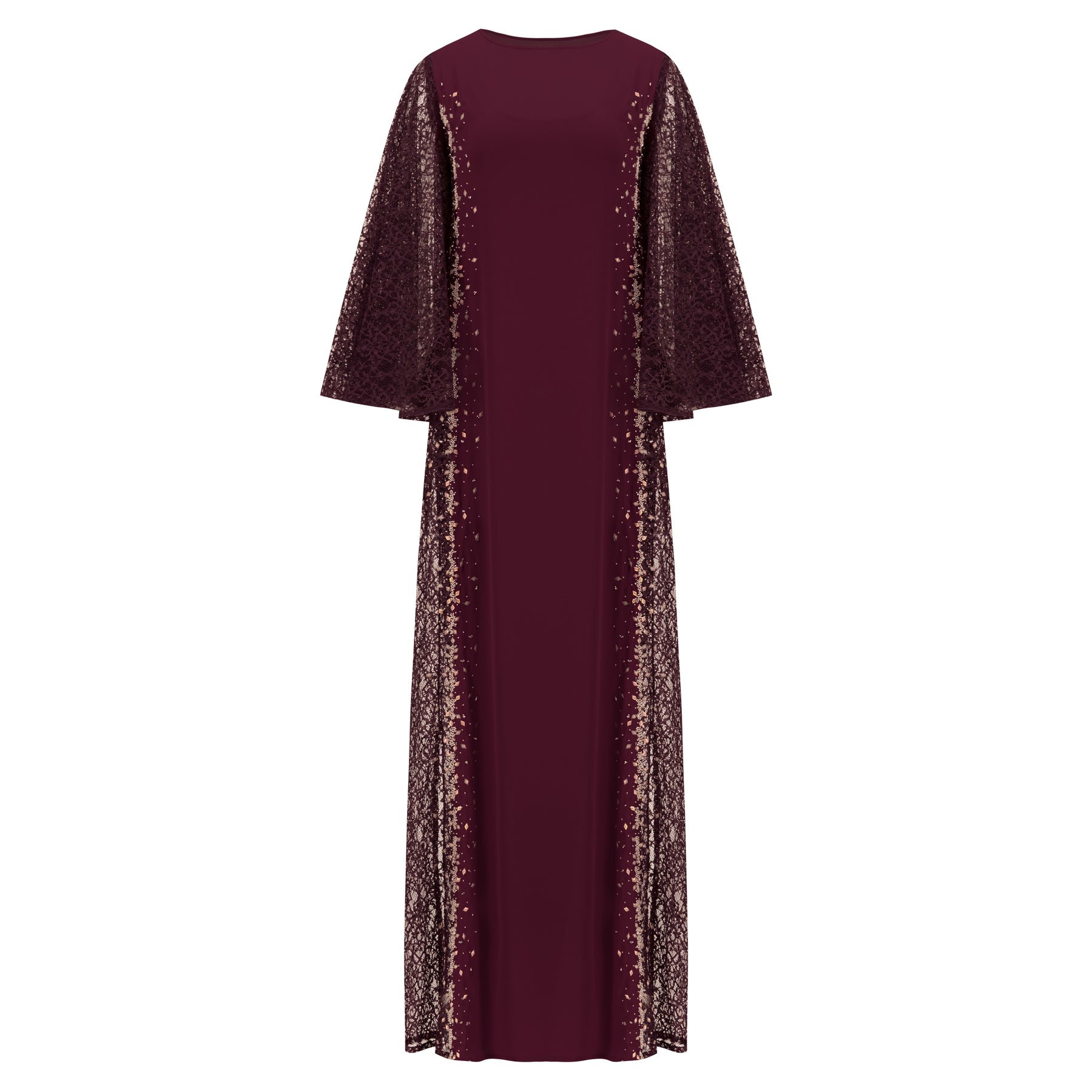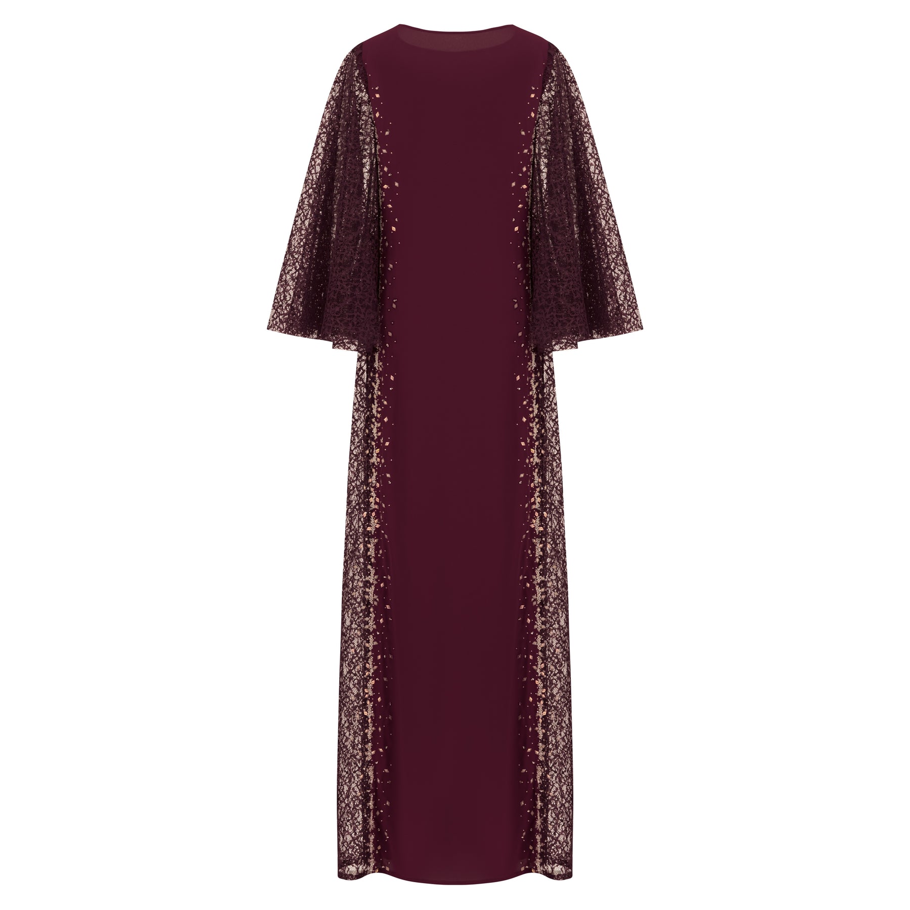 A two-texture dress with plain front and backwith flared side sleeves in delicate Raschellace, and scattered embellishmentson both sides