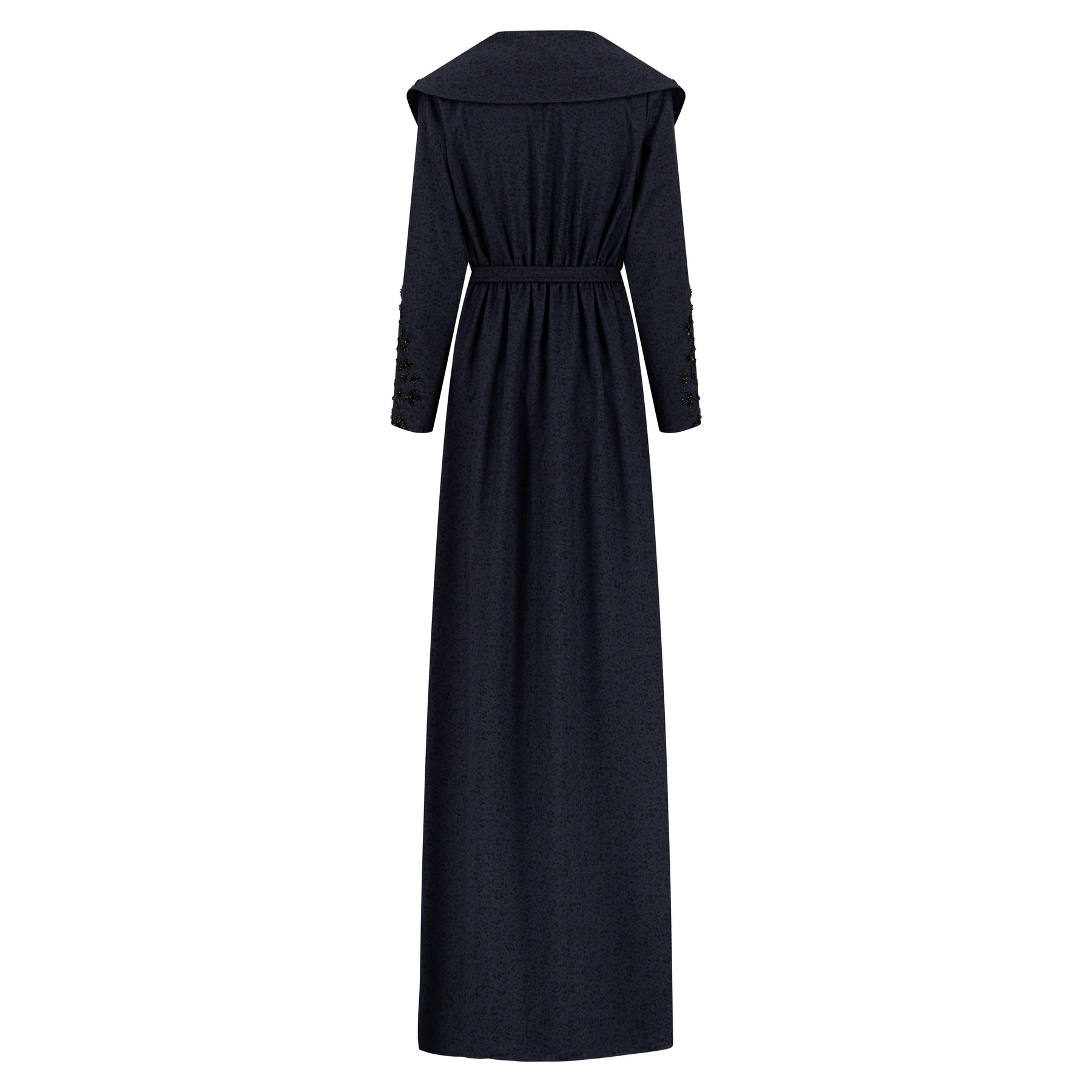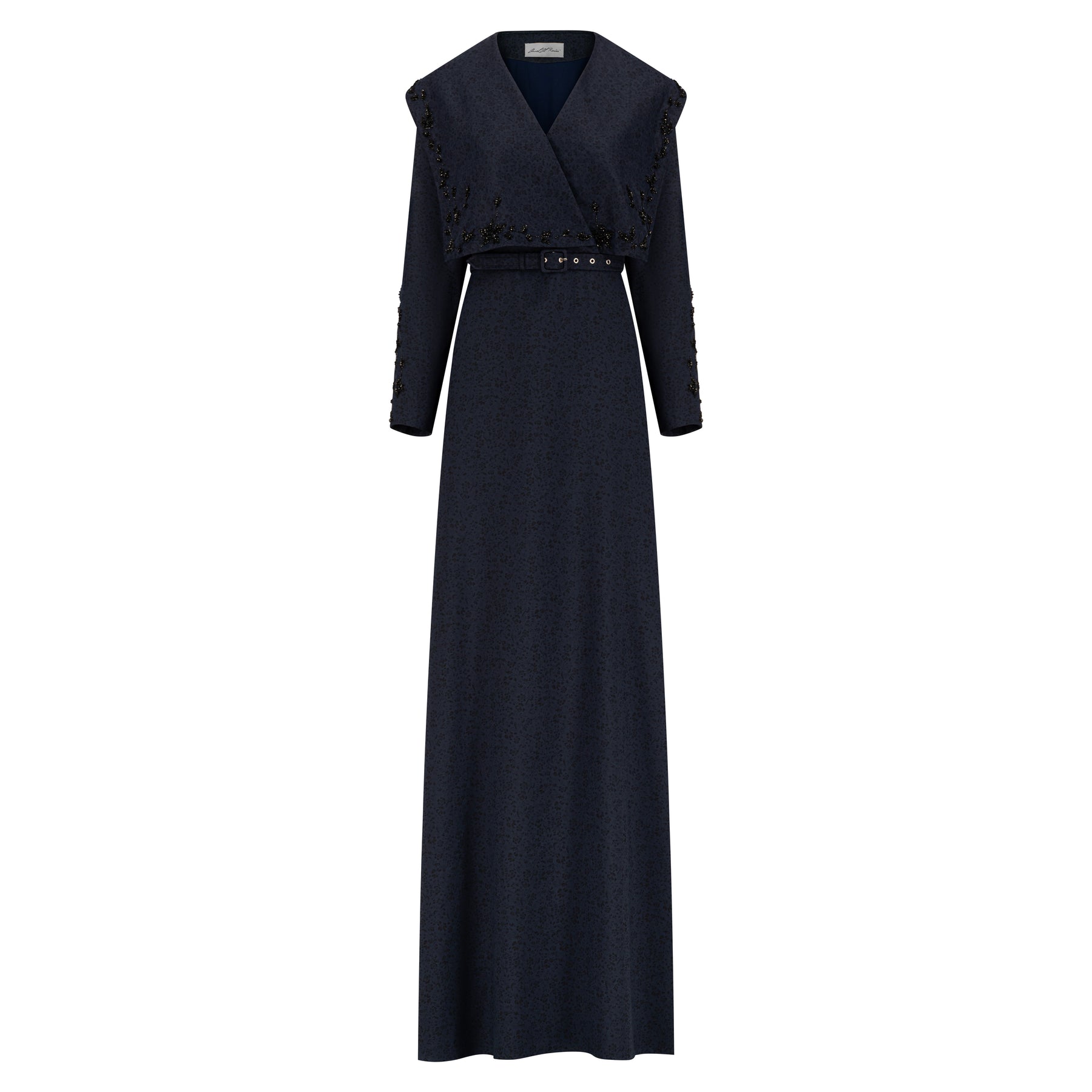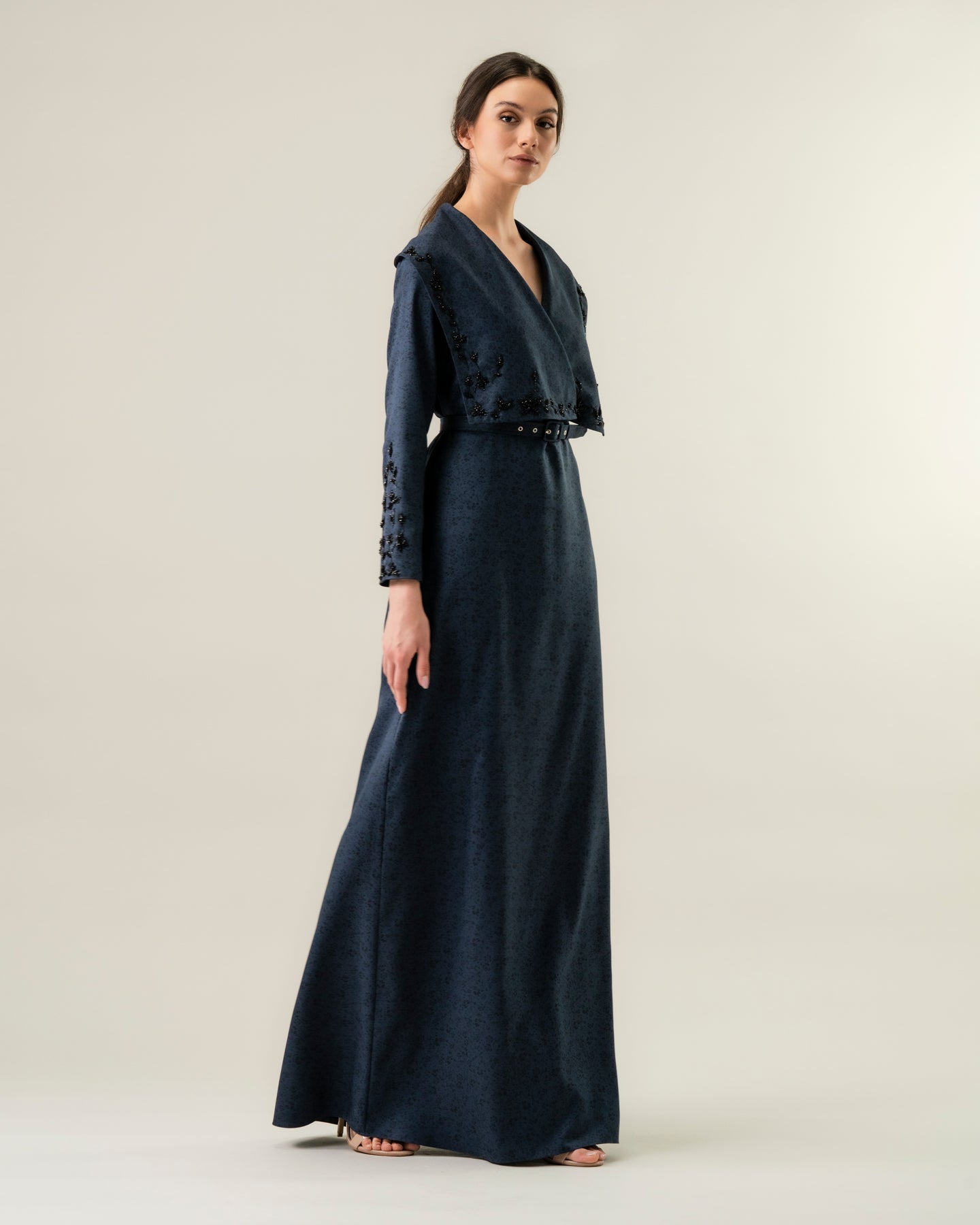 Printed dress with a V-neck and bold square collar embroidered along the edges, full sleeves with delicate embroidery, and a belt.