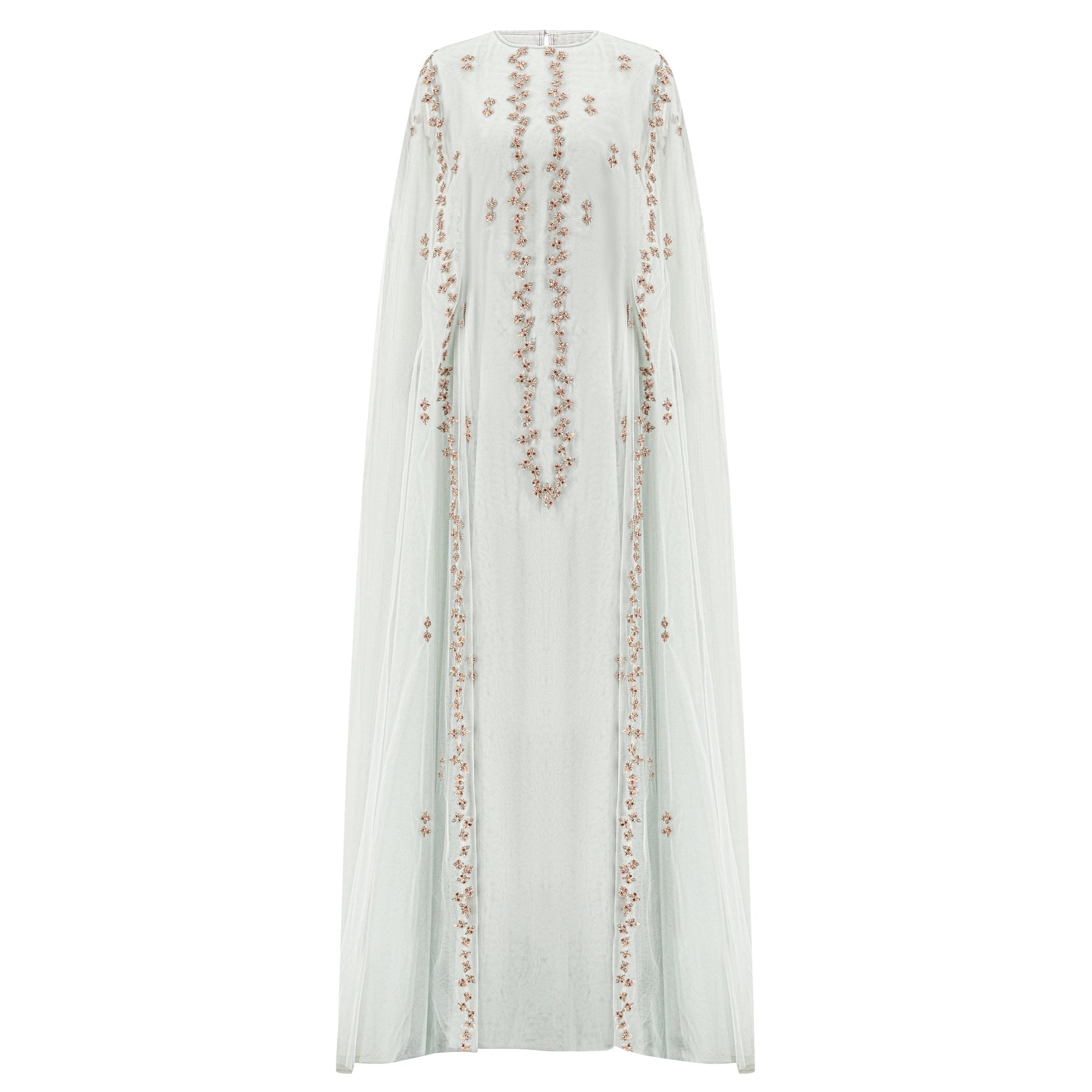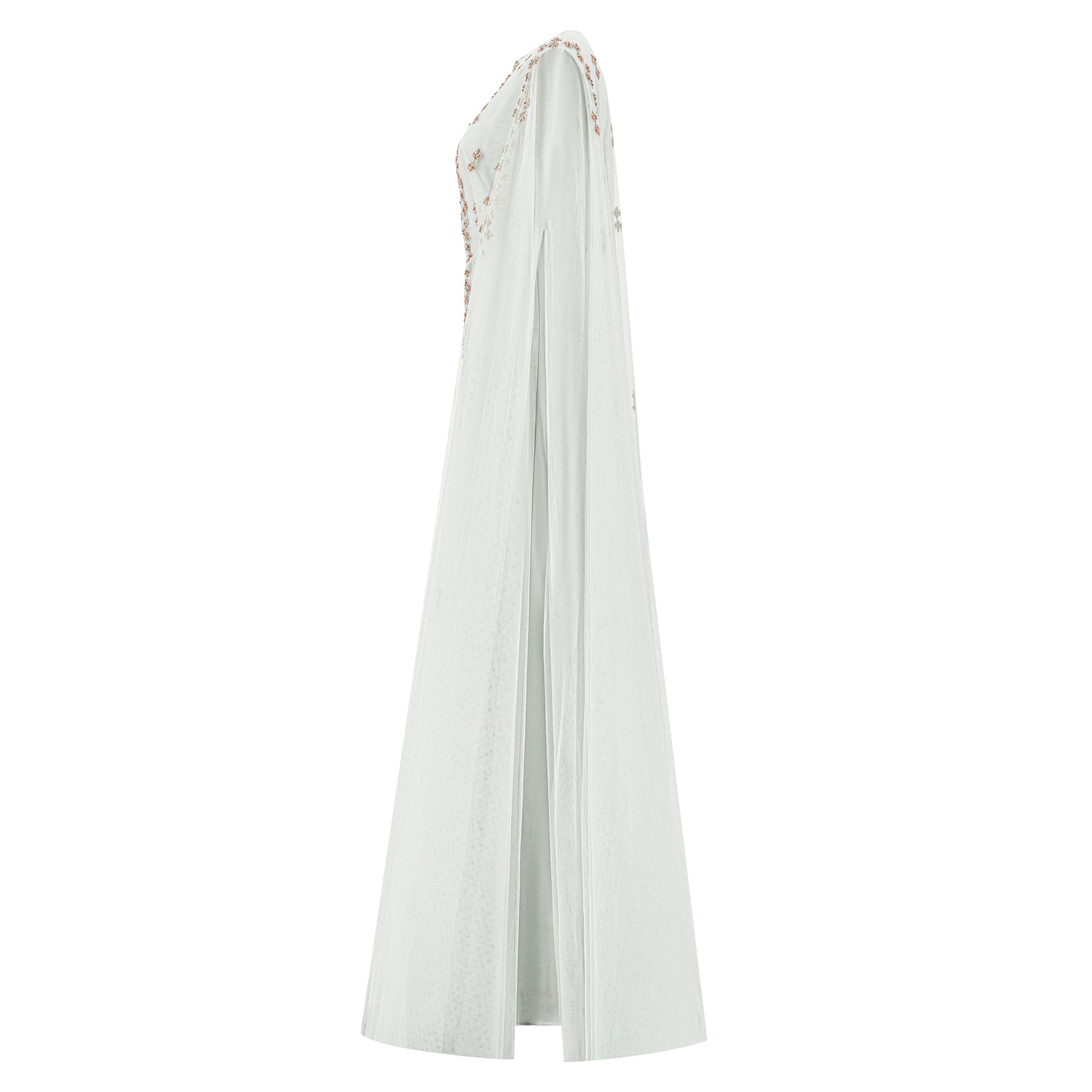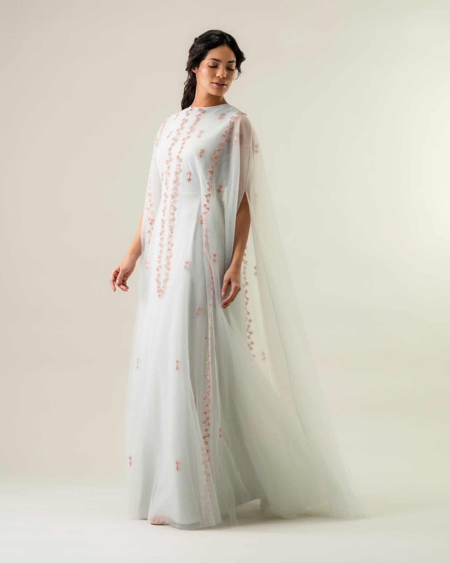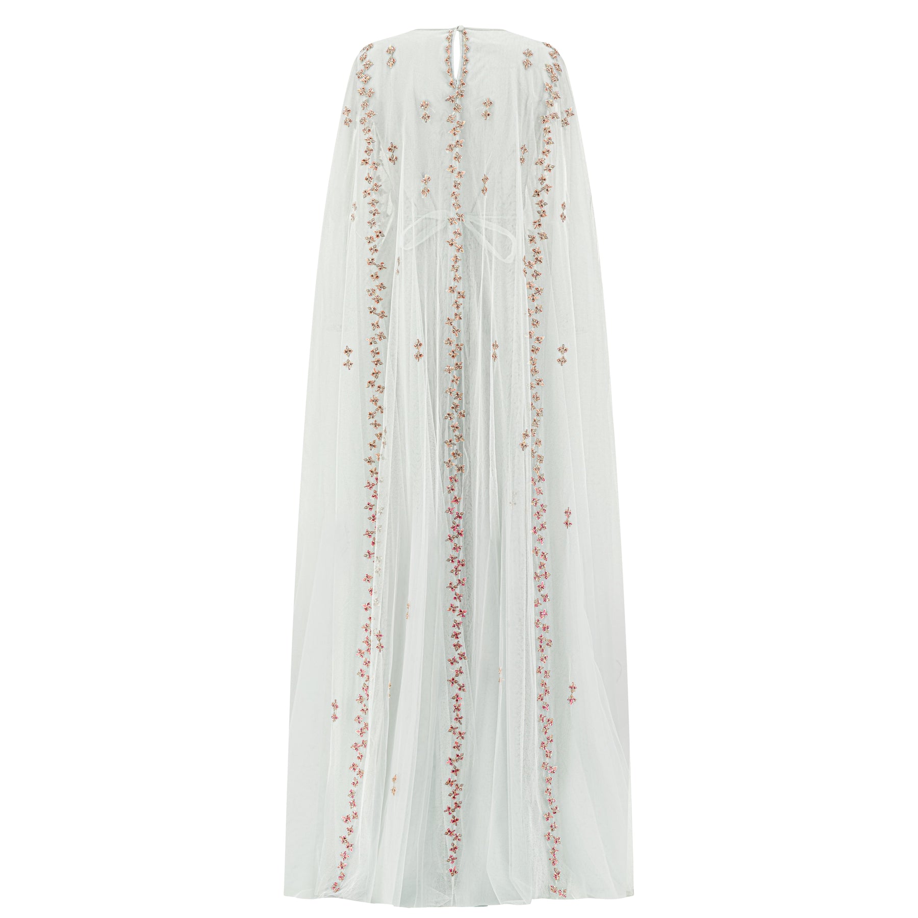 A-line tulle cape featuring embellishments along the front neckline and scattered detailing across the tulle cape