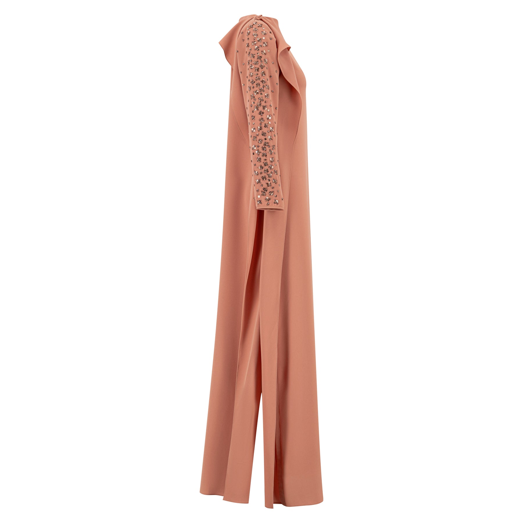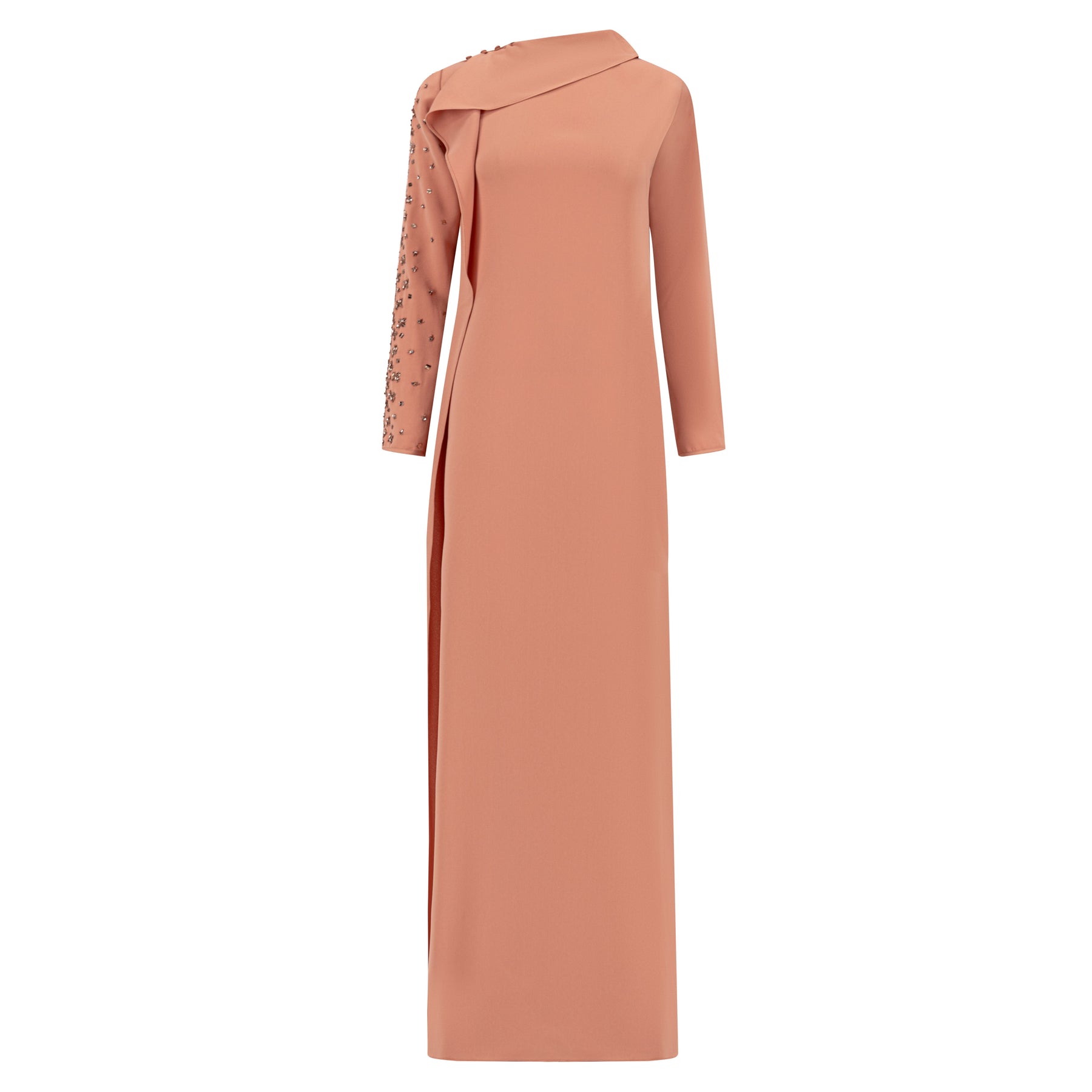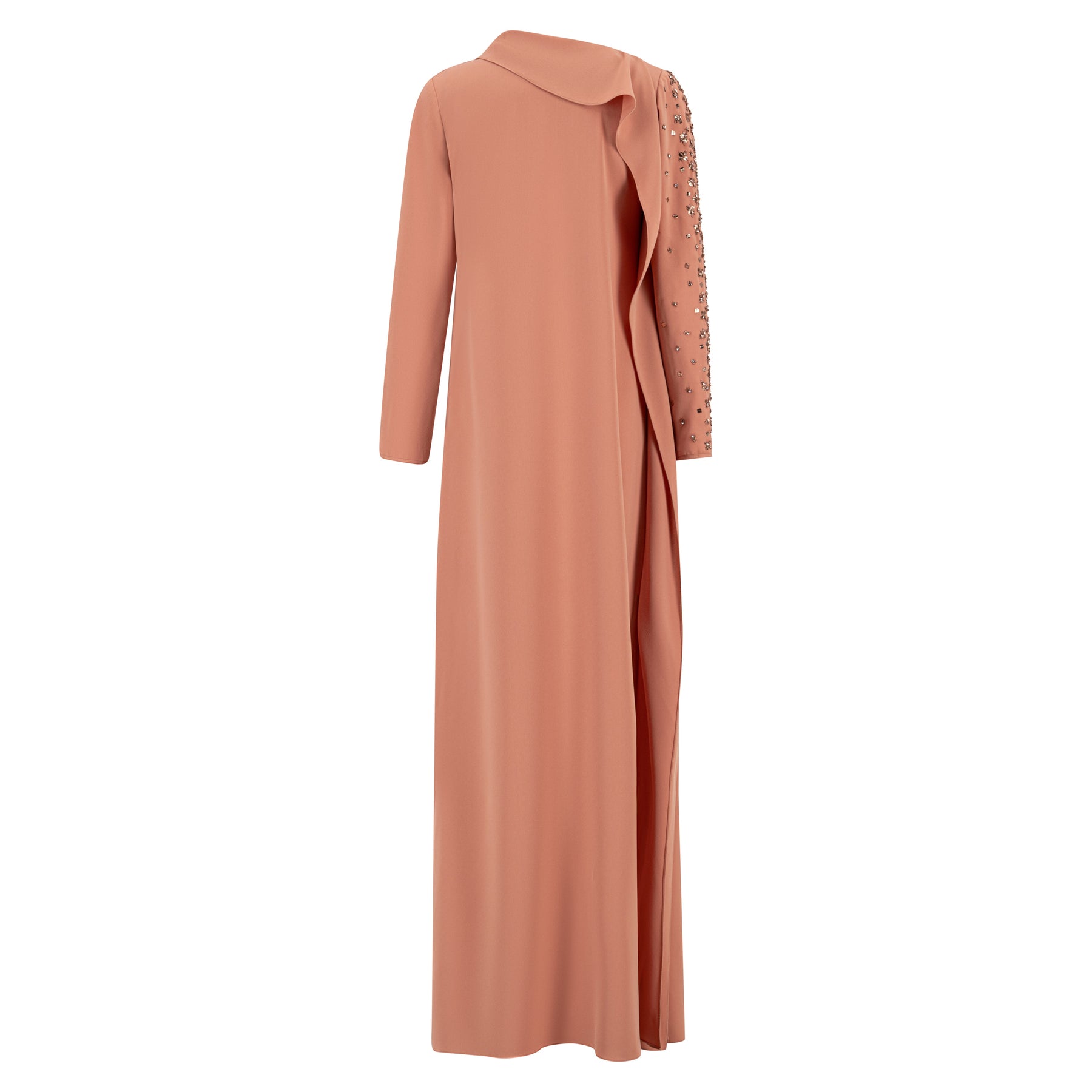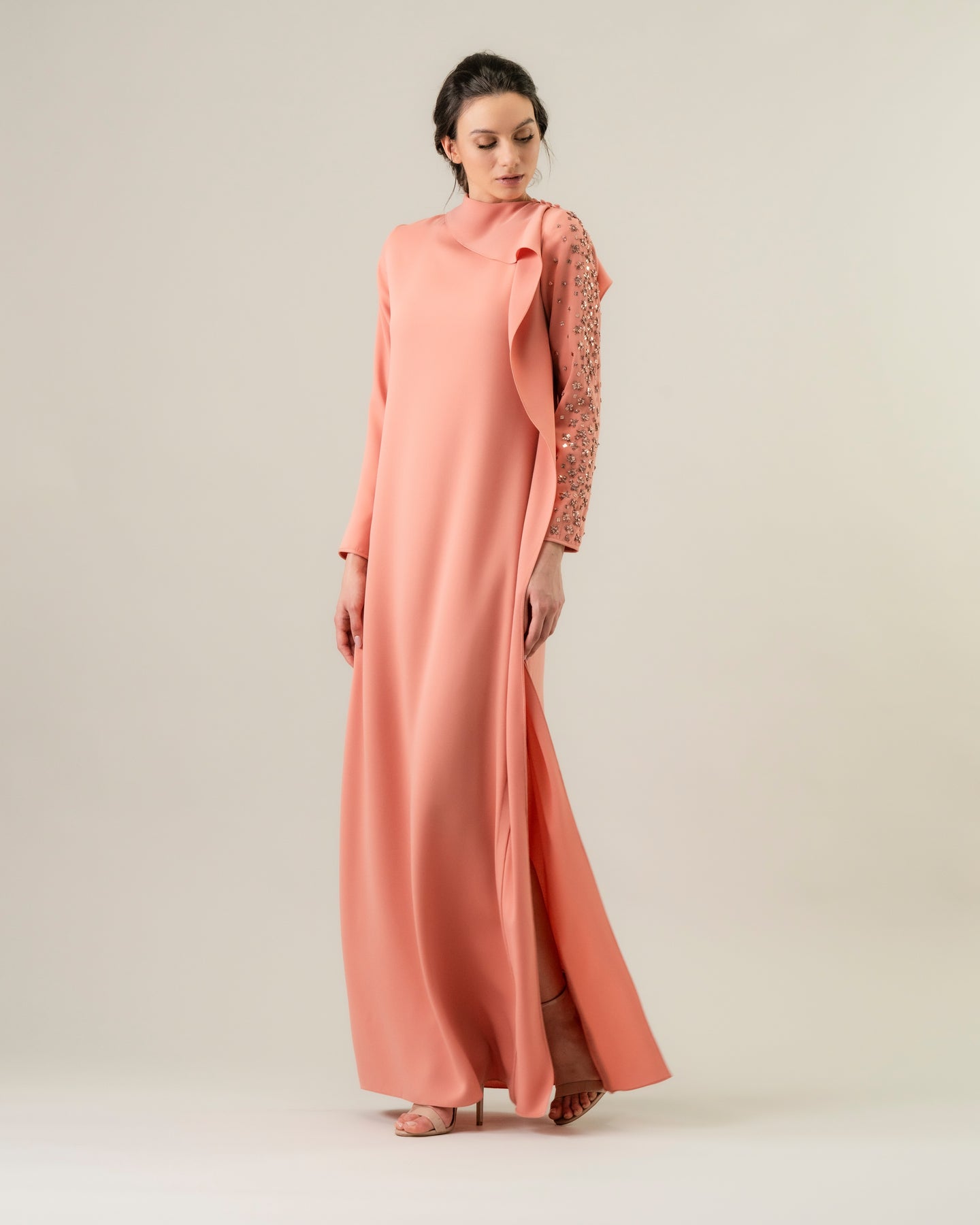 Dress with ruffle detailing along the neckline all the way down front & back with buttons, and intricate embellishment on one side