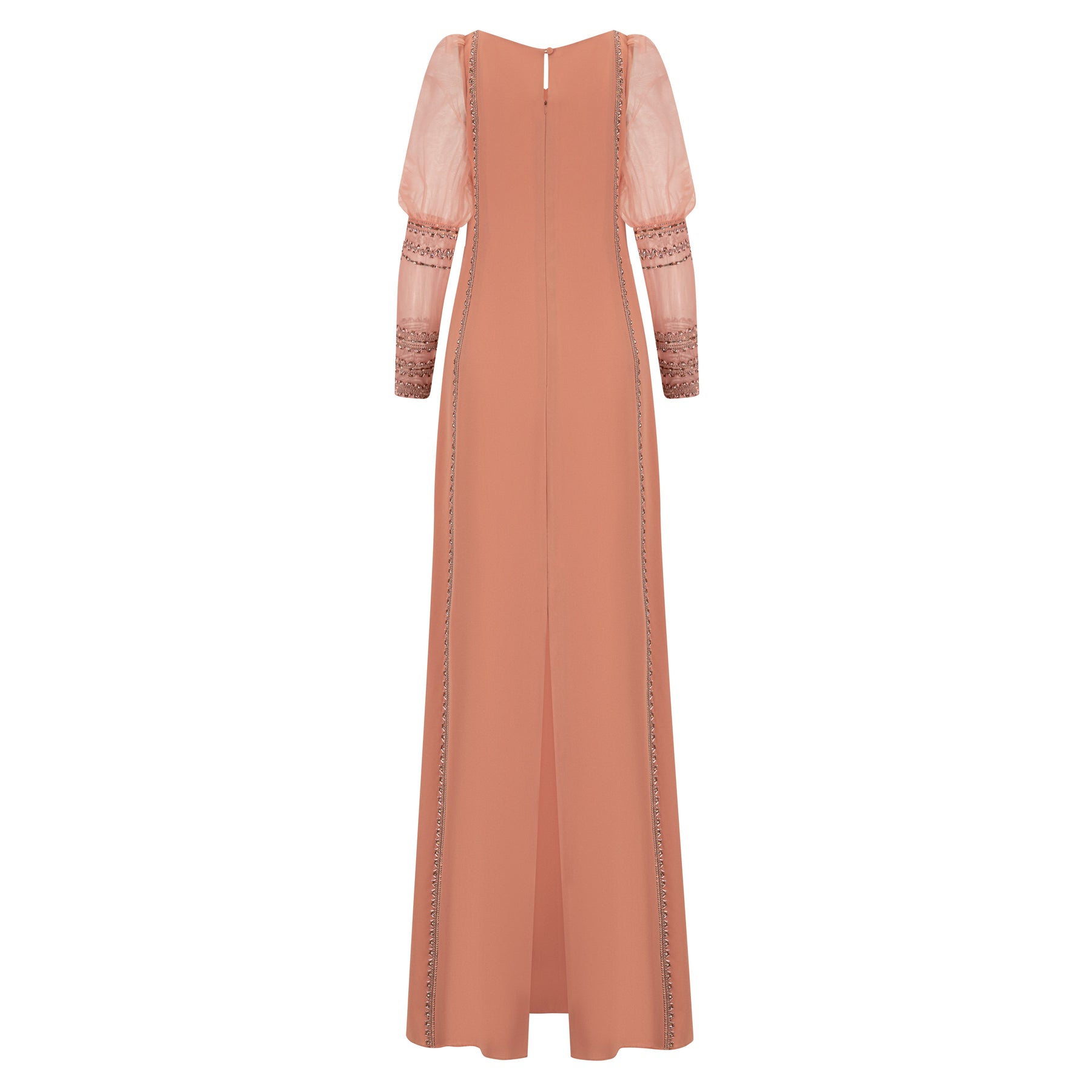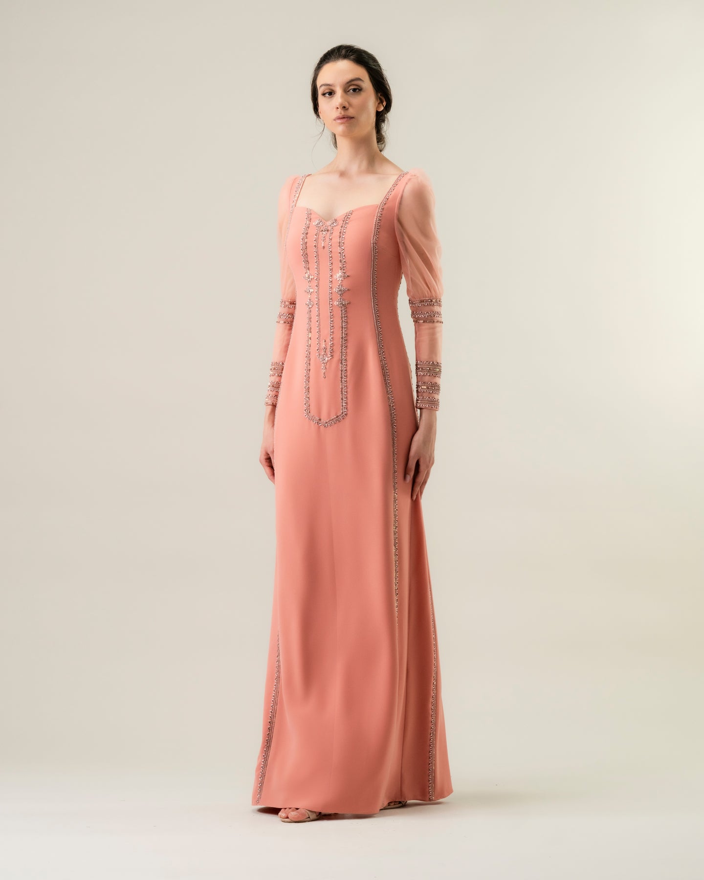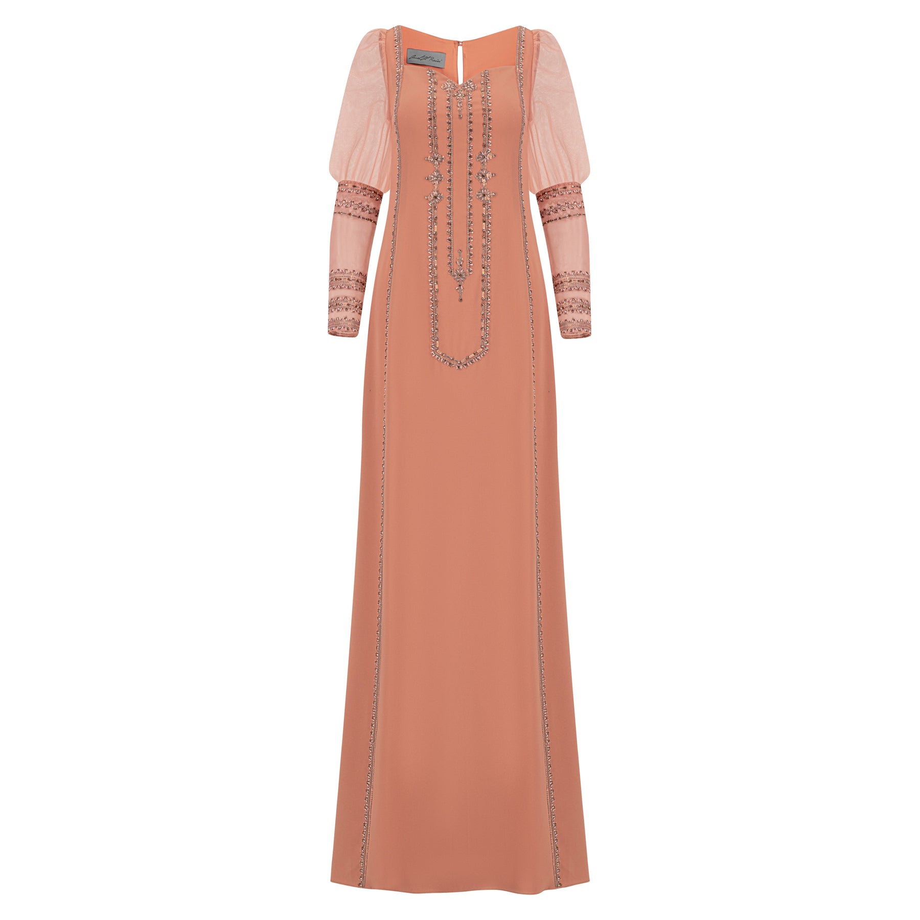 Straight-cut dress with intricate embellishment along the neckline and shoulders, downward. Finished with puffed tulle sleeves that taper down with delicate embellishments