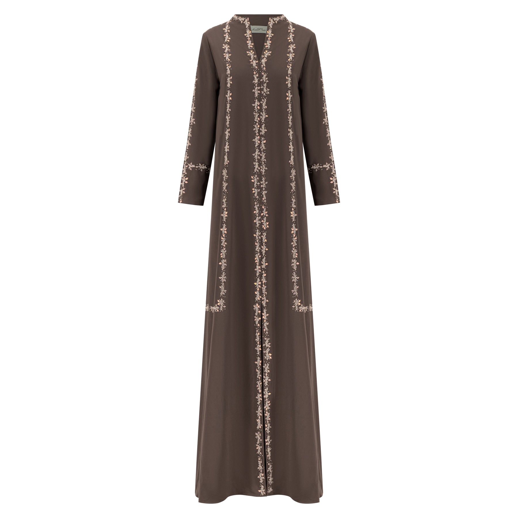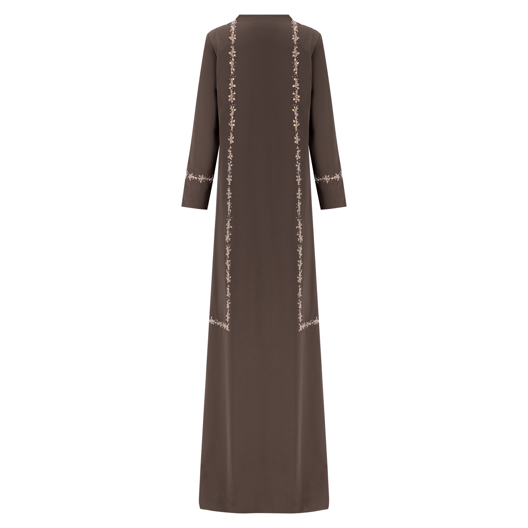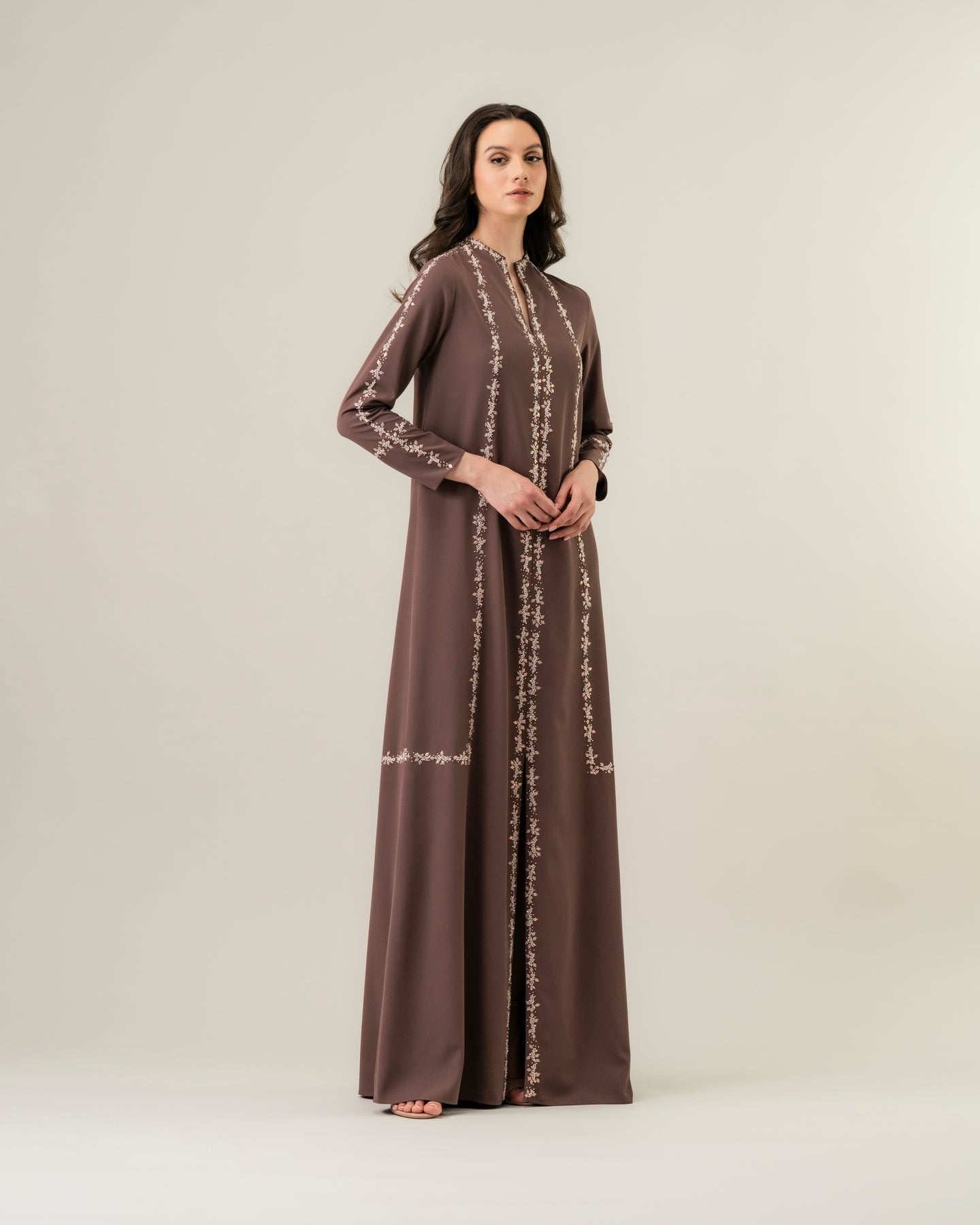 Dress with a round-neck collar and front V-slit, hand embroidery down the center, bordered shoulder detailing, and elegantly embroidered sleeves.
