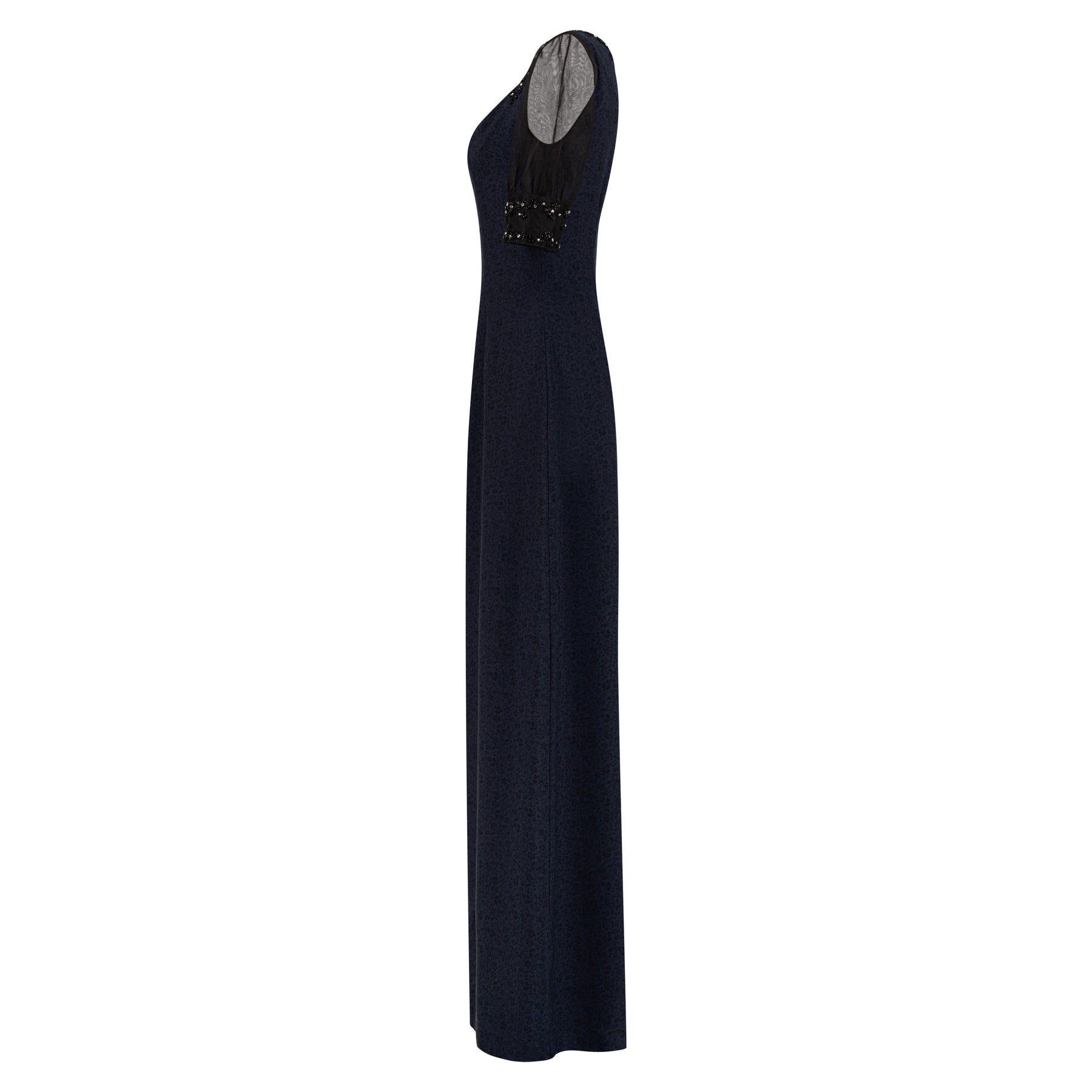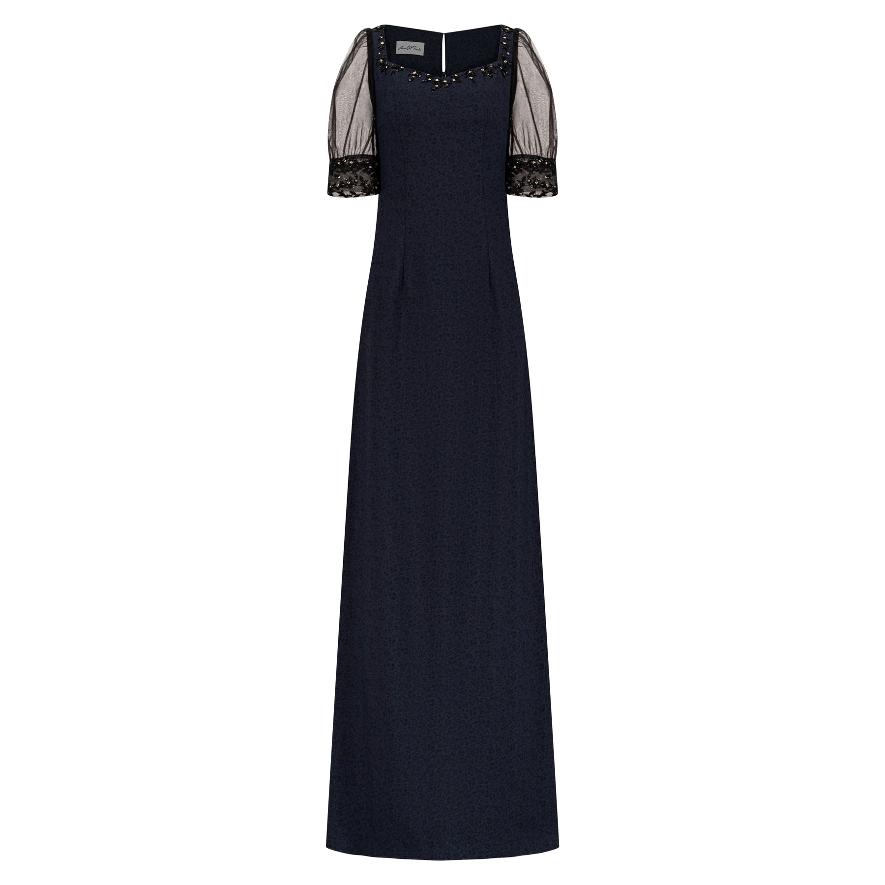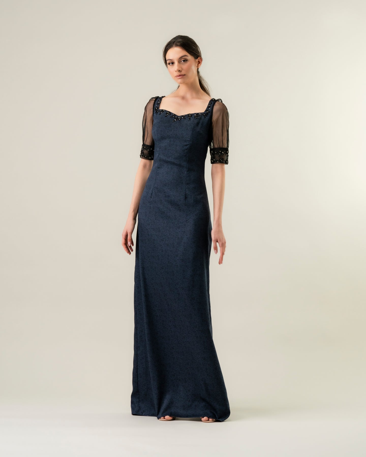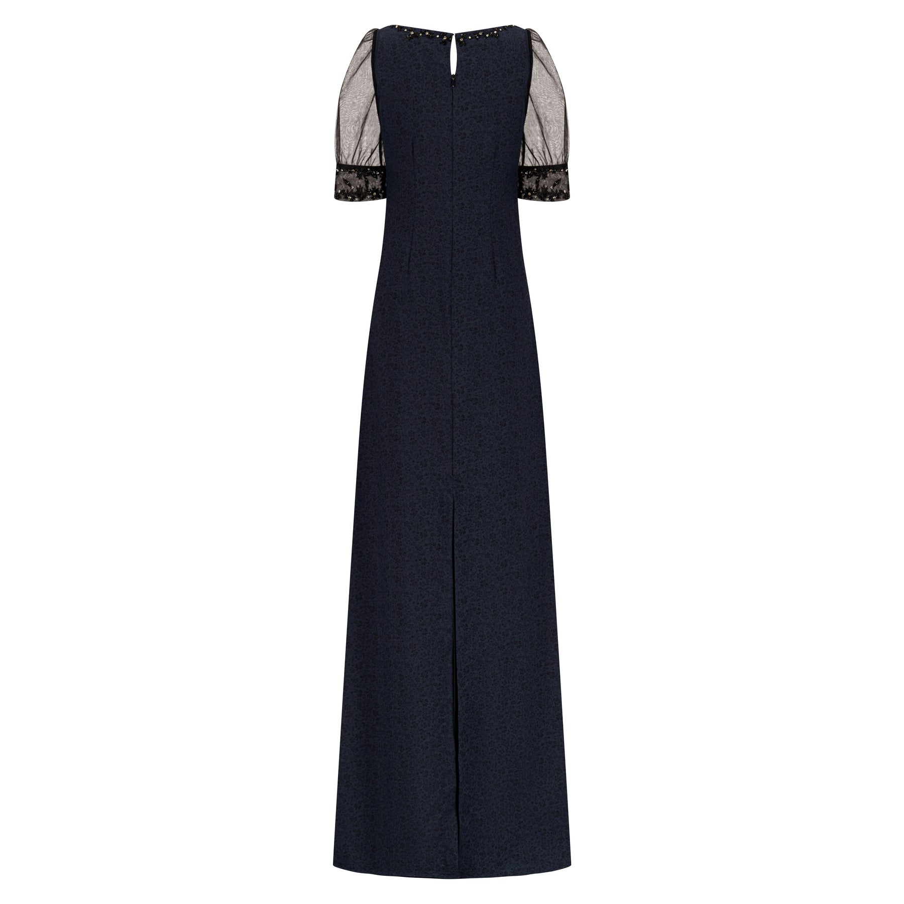 Printed dress with tulle puff sleeves and intricate handwork around the neckline, shoulders, and sleeve cuffs